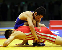 のの、全日本選手権は4位だった。無名の存在から21歳にして全日本2位に駆け上がった清水の急成長ぶりは、日本レスリング界初の快挙かもしれない(右写真=全日本選手権決勝で飯室と闘う清水)。