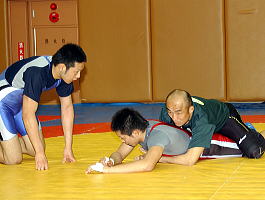 それでも全日本2位になったことで、21日からの冬の遠征に抜てきされ、ギリシャ〜ハンガリーと渡って試合出場と合宿をこなしてくる。外国選手との手合わせは初めて。「不安です」と言う清水に対し、手ぐすねをひいて遠征を待っているのが監督として同行する自衛隊の元木康年コーチ。「せっかくの機会だから、積極的にやらせます。練習ではマットの隅にはいさせない。どんな時でもマットの中央にいさせて、強いヤツと闘わせます」と楽しそう(左写真=清水を指導する元木康年コーチ)。