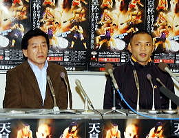 練習に先立って行われた記者会見(右写真=高田裕司監督とKID)で、KIDは「あと2週間、追い込んだ練習をしたい。けがをしないようにし、頑張ってやっていきたい」「(出場するフリースタイル60kg級は)世界で通用する選手ばかり。自分の力を出し切りたい」と、控えめな言葉に終始。プロの一流選手ならば強気なマイクパフォーマンスで世間の関心を引きつけるのが普通で、プロボクシングの亀田興毅選手ほどではなくとも、それを期待していた約50人の報道陣もちょっぴり拍子抜け。
