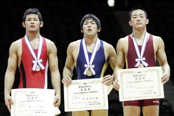 2004年アテネ五輪と2008年北京五輪の2大会連続五輪代表の池松和彦(福岡大助手)が、12月22日の全日本選手権男子フリースタイル66kg級に“凱旋(がいせん)”出場。初戦(2回戦)は自衛隊の坂本将典をストレートで下したが、準決勝で大学3年生の森川一樹(山梨学院大)にフルピリオドの末に敗れ、3位という結果だった(左写真=左から森川、米満、池松)。