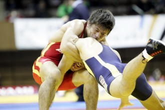 2000年シドニー五輪から3大会連続五輪代表、そして2007年世界選手権銀メダリストの笹本睦(ALSOK綜合警備保障)が本来の階級から1階級アップしてグレコローマン66s級に挑戦した。初戦は豪快なリフト技で得点を稼いで快勝したが、2回戦で全日本選抜選手権準優勝の岡本佑士(拓大)に「浮いてしまった」と悔やんだローリングを食らって、1−2で敗退した。(左写真=がぶり返しで岡本を攻めた笹本だが…)