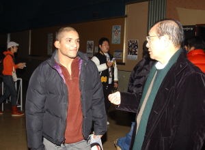 「1ラウンドは攻勢だったので、油断があった。課題を残しちゃったね」。3戦目にして黒星を喫し、がっくりの表情のマキシモ。応援に来ていたベネズエラ在住30年の阿久津英紀さん(明大OB=元ベネズエラ・ナショナルチーム監督)からの「あれほど関節と絞めに注意しろと言っていただろ」という叱咤(しった)を、「はい」と神妙な顔で聞きながら(左下写真)、未知の闘いで勝ち抜くことの難しさを痛感したようだ。