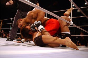 第2ラウンドも攻勢だったが、四つんばいの相手に前方からひざ蹴りを見舞った攻撃が反則ととられイエローカード。再開後にタックルでテークダウンを取り、上のポジションを取って再び攻勢をとったが(右写真)、うまくリバースされ(上下を入れ替わられる)、肩を固められ、じりじりとけい動脈を絞められてしまった。