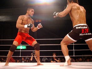 総合転向のあと練習している吉田道場から、滝本誠(シドニー五輪柔道金メダリスト)、中村和裕といった同道場の先輩がセコンドについて試合開始。第1ラウンドは、グラウンドで下になるシーンもあったが、ブリッジワークで返す驚異的な体力で脱出。パウンド(グラウンドで仰向けになっている選手への上からのパンチ)も一発一発が強烈で、明らかに攻勢をとった。