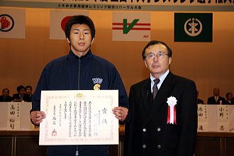 2008年学生大会最終戦(新人戦は除く)の全日本大学選手権は、日体大が5年ぶり19度目の優勝で幕を下ろした。大会MVPには日体大主将で96s級で優勝した門間順輝が選出された(右写真=MVPを受賞。右は伴義孝全日本学生連盟会長)。門間主将は最後の学生大会を優勝で締めくくったことでホッとした様子。表彰式後は優勝カップとともにチームで記念撮影を行った。
