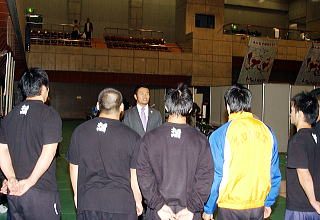 初日のスタートはひな壇に上がって、他大学の監督・関係者のあいさつ回りが続いた。アマとプロの交流がさかんなレスリング界だけあって、「みなさん、とっても温かかった」と須藤監督もレスリング界のキャパシティの広さに感激したようだ。