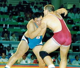 130kg級に上げて92年バルセロナ五輪にも出場(左写真)し、その後、プロレスの世界に身を投じた。「日本重量級最強の選手は?」という話題になると、必ず名前が出てくる選手。日本の重量級に一時代を築いた。
