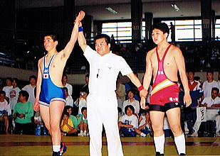 タックルを続けながらも負けた選手には、「オレの指導が悪かった」と、その選手にあやまるという意外な(?)一面もあるというから、一方的な厳しさだけではない。「自分の子がよければ、というところはなかった。どの選手も平等に接してきた」。これらもすごいと思うことだ(右写真=1995年に全国中学生選手権で2連覇を達成した時の栄利さん)。