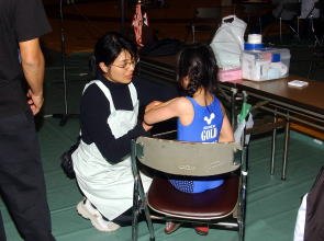 ちょっとした出血などの場合は、けがのケア以上に「続けられるように心理面のケアに力を入れるようにしています。励まして試合が続けられるように元気を出させます」と気を遣っている(左写真=負傷した選手の手当てをする辻本さん)。