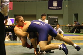 初日が終わって日体大と6点差の2位。逆転可能な差だが、それには自分が優勝することが必要条件。「緊張しましたね」と言う。しかし動きが硬くなるほどではなく、自分のレスリングができたのは、「(2度の個人大会優勝の)経験でしょうか」と言う(左写真=決勝でがぶり返しを決める)。