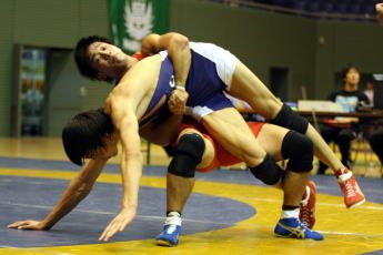 ついに獲得したタイトルだった。全日本グレコローマン選手権74kg級の倉谷修平(日体大)は、中井伸一(中大)との決勝戦を2−1で制し、やっと勝利宣告を受けた(右写真=中井を攻める倉谷)。倉谷にとって最後の学生の大会となる今大会。全日本選手権も含めて表彰台に昇った経験は数え切れないほどしてきたが、ビッグタイトルには、いつもあと一歩及ばなかった4年間。最後のチャンスをものにした倉谷にはようやく安堵の表情が見られた。