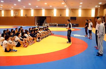 出場を辞退した伊調千春・馨の姉妹も練習に参加。大会では選手の第2セコンド(2人のセコンドのうち、試合中はマットから離れた場所で待機するセコンド)につく予定で、マットサイドから、あるいはピリオドの合間に選手にアドバイスを送ることになった(右写真=選手を激励する富山英明強化委員長)。