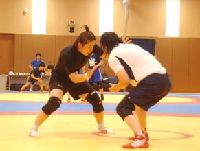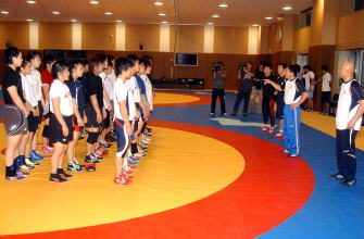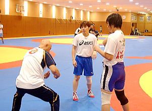 富山英明強化委員長(日大)も見守る中、北京五輪55kg級金メダルの吉田沙保里(ALSOK綜合警備保障)、前回の合宿には参加しなかった北京五輪72kg級の浜口京子(ジャパンビバレッジ)も参加し、7選手がそろっての熱のこもった練習が展開された(右写真=選手を激励する富山強化委員長)。