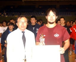 持ちながら日体大に出向く学生もいたほど。だが、実際に日体大のマットに立ったことが早大レスリング部員のメンタルを確実に変えた。浅見が「追い込んだ状態での(技術の)差はなかったし、練習雰囲気も負けていなかった」と話すとおり、全員が自分の強さに気づくきっかけになった(左写真=MVPに輝いた浅見。左は全日本学生連盟の伴義孝会長)。