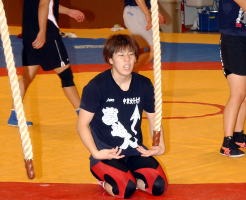 この日の練習では、時に苦しそうな表情を見せ(右写真)、五輪V2の選手といえども休養のあとの合宿はかなりきつそう。「あらためてレスリングはきつい競技なんだなあ、と思いました」と話し、まず体力を元に戻すことを主眼におく合宿になりそうだ。