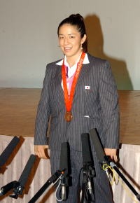北京オリンピックで2大会連続銅メダルを獲得した女子72kg級の浜口京子(ジャパンビバレッジ)が9月9日、都内で行われたジャパンビバレッジの「北京オリンピック報告会」で、10月11〜13日の世界女子選手権(東京・代々木第1体育館)での優勝を宣言した(右写真=報告会のあと記者会見に応じた浜口)。