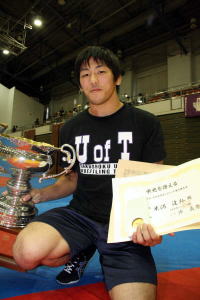 全日本学生選手権最終日は8月31日、大阪・堺市金岡公園体育館で男子フリースタイルの決勝までが行われ、66s級で昨年優勝の米満達弘(拓大=右写真)が圧勝で連覇。大会両スタイルあわせての最優秀選手に与えられる文部科学大臣杯を受賞した。
