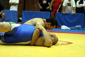 得意のローリングを出したところ、絞りが甘く、乗られてしまって逆にニアフォールの体勢に持っていかれてしまった。「失敗だった」と気を取り直し、第2ピリオドのスタンドで強烈な投げ技で逆転フォール(左写真)。決勝進出を決めた。