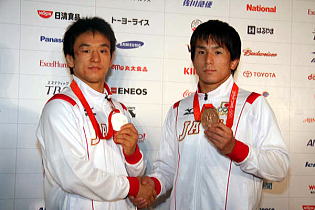 8月19日に行われた試合で銀メダルを獲得した男子フリースタイル55kg級の松永共広(ALSOK綜合警備保障=右写真の左)と銅メダルの60kg級・湯元健一(日体大助手=同右)が一夜あけた20日、北京市内のジャパンハウスで記者会見に臨んだ。ともに試合を終えてほっとした表情を見せ、今の率直な思いを語った。