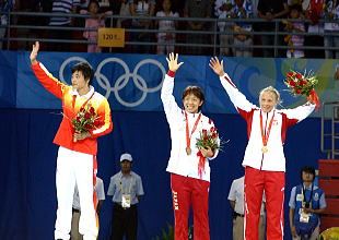 準決勝でノーマークとも言えた中国選手に不覚の敗北。それはアテネ五輪と同じ状況だった。緊張の糸が切れそうになる状況と必死に闘い、気力を振り絞って3位決定戦を闘ったことも同じ。そして同じように「金と同じ」と書く「銅」メダルを手にした(右写真=表彰台で手を振る浜口)。