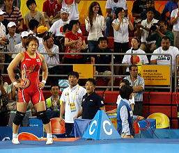 2005年アジア選手権(中国・武漢)では村島文子相手に、女子重量級では考えられなかったジャーマンスープレックスさえ見せた脅威のパワーの持ち主。栄監督の警戒どおり、20歳の成長株に足元をすくわれることになった(左写真=王嬌に敗れた浜口を後方から両親が見守っていた)。