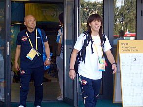 伊調は「いい組み合わせです」と笑みを見せながら話し、吉田は「強い選手ばかりが集まる大会。誰が相手でも同じです」と話して、選手村へのバスに乗り込んだ(右写真=栄和人監督とともに計量会場を出る吉田沙保里)。