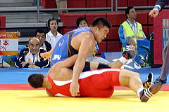 松本は1回戦で2006年欧州2位のデニス・フォロフ(アルメニア=元ロシア)と対戦。第1ピリオドに俵返しを受けるなどして先制され、第2ピリオドもグラウンド攻撃に屈した。加藤は昨年世界5位のダイゴロ・ティモンチーモ(イタリア)と対戦。第1、2ピリオドともポイントを取ることができずに敗れた(右写真=日本からの応援団を背に闘った松本だが…)。