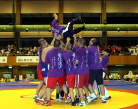 全国高校総体レスリング選手権大会(インターハイ)第2日は8月2日、埼玉・東松山市の大東大で学校対抗戦の決勝までが行われ、霞ヶ浦(茨城)が決勝で花咲徳栄(埼玉)を4−3で破り、3年ぶり19度目の栄冠を手に入れた(右写真=優勝し、胴上げを受ける大沢友博監督)。