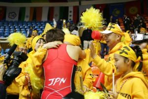 浜口の行く道には、常に父がいて、母がいて、家族がいて、応援団がいた。だれよりも多くの声援が浜口を後押ししてきた。北京の会場でも、浅草応援団を含め大勢のサポーターが観客席に陣取るだろう。だれもが、闘う浜口と心をひとつにして(左写真=3月のアジア選手権で優勝し応援団に迎えられる浜口)。