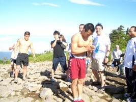 7月中旬の長野・菅平合宿で3度目の根子岳に登頂した男子フリースタイル66kg級北京五輪代表の池松和彦(K-POWERS=左写真)は、頂上に祭られた祠に「五輪で一生懸命がんばります」と手を合わせた(右下写真)。