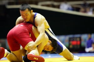 アジア選手権で優勝できなかった理由は、現行ルールのセオリーを踏んだからだ。アジア選手権2回戦のキム・ソンナム(北朝鮮)との一戦は(左写真)、序盤で1点を取ったあと、一進一退の攻防を見せる。1点を大事に守ろう…。この考えは今のルールでは定石だが、攻めのレスリングに定評のある池松には1点を守った方がリスクが高かった。
