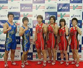 この日の披露会見では、男子グレコローマンの笹本睦選手(ALSOK綜合警備保障)と松本慎吾選手(一宮運輸)、女子の4選手が出席(左写真)。いずれも「体にぴったりフィットし、動きやすそうだ」という感想を述べるとともに、1ヶ月後に迫ったオリンピックへ向けて戦闘モードに入りそうな様子。女子はこの日から始まった合宿でさっそく“試着”した。