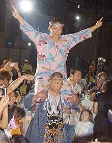 父のアニマル浜口さんは「だれにも負けないという気持ちがあれば、だれにも負けない」とあいさつし、北京五輪での金メダル獲得を宣言。浜口選手は「アテネまでの道に比べ、北京までの道は正直言って辛いものがありました。でも、多くの方の支えがあったから乗り越えることができました。どん底からはい上がってオリンピックの出場権を獲得した時が一番うれしかった。自分を信じて伸び伸びやれば、一番輝いているメダルを取ることができると思います」と、やはり金メダル獲得を力強く宣言した(左写真=最後は、北京での再現を願いつつ親子の十八番で退場)。