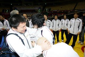 それでも新海には自信がある。この1年間、伊調馨から引き継いだ伝統ある中京女大の主将を務めた。「プレッシャーはありましたよ。3代続いて五輪出場者が主将だったんですから(伊調千春、吉田沙保里、伊調馨)」と本音を吐露。しかし、その主将を経験して一回りもふた回りも成長した(右写真=富山英明強化委員長が新海に栄和人監督の頭にキスを命令し、強引にさせようとするが、新海は徹底拒否!)。