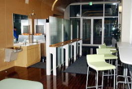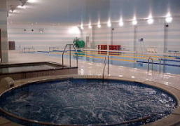 | 天井にはビデオカメラが設置。 | レスリング場と同じフロアにある25mプールとジャクジー風呂。 | 各競技場間にあるラウンジ。異種競技間の選手の憩いの場となるか。 |