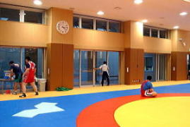 | 戦闘機1機分、約370億円をかけたNTCの屋内施設。柔道、卓球、体操など10競技の練習場がある。 | 3スタイルの全日本チームが同時に使用しても窮屈とは感じない広さ。1スタイルだと、逆に寂しいくらい。 | 地下1階だが、ガラス戸の向こうは地上への吹き抜けになっており、地下という圧迫感は少ない。 |