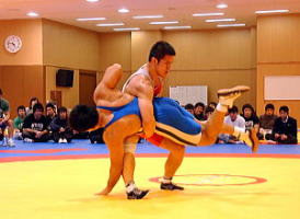 男子グレコローマンの全日本チームが2月4日、2日前に完成式が行われたナショナルトレーニングセンター(NTC)で今年2度目の合宿をスタート。全日本選手権1位の選手と2位の選手との参考試合が行われ、3月のアジア選手権(グレコローマンは22〜23日、韓国・済州島)へ向けての日本代表争いが続けられた(右写真=練習試合で闘う84kg級の松本慎吾選手)。