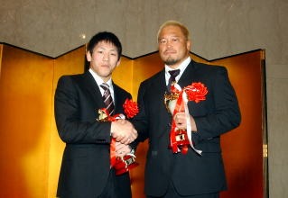 現在は、時に低周波治療を受けるなどのほかは安静にすることで完治を待つ状態。全日本チームが冬の遠征などで鍛える時期に国内に居残ることになりそうだが、「(肩以外の)練習はしっかりできています。焦らずにしっかり直し、(5月予定の)全日本選抜選手権までにしっかり仕上げたい」と話した(左写真:自衛隊の先輩の杉浦貴=プロレスリング・ノア、殊勲賞を受賞=とともに)。