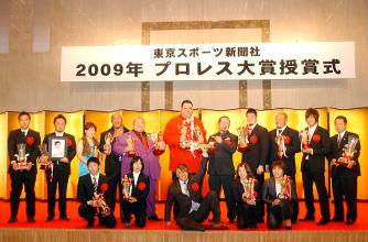 東京スポーツ新聞社制定「プロレス大賞」の受賞式が12月16日、都内で行われ、レスリング特別賞を受賞した男子フリースタイル66kg級の米満達弘(自衛隊)、女子51kg級の甲斐友梨(アイシン・エイ・ダブリュ)、同55kg級の吉田沙保里(ALSOK綜合警備保障)、同63kg級の西牧未央(中京女大)の4選手が出席。賞状、トロフィーなどを受けた(右写真=前列中央が大賞の棚橋弘至=立命館大OB。その両脇に4選手)。