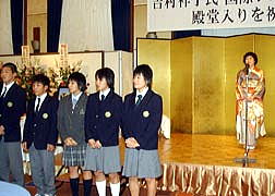 | JOCアカデミーの選手の先導でステージに上がった吉村コーチ。 | 「吉村コーチがあこがれ」浜口京子選手が気合十分の声で「カンパーイ!」 | FILA殿堂入りの先輩の高田裕司、富山英明の両氏があいさつ。 | 最初はレスリングをすることに反対だった両親も、今は孝行娘に感謝。 |