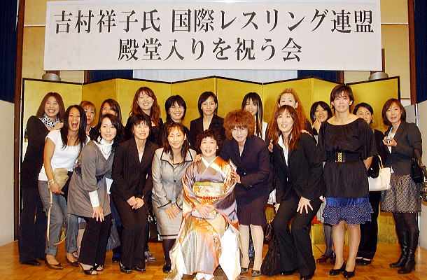 世界V5の吉村祥子・日本協会女子強化委員会コーチ(エステティックTBC)の「国際レスリング連盟(FILA)殿堂入りを祝う会」が12月1日、都内のホテルで行われ、女子プロレスラーの井上貴子さんら1980年代に吉村コーチと女子レスリングに取り組んだ懐かしい人も数多く訪れ、快挙を祝福した(右写真=1985年のスタート直後にレスリングに取り組んだ選手が勢ぞろい)。
