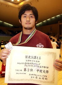 格闘技歴がなく、大学進学後にレスリングを始めた初心者からのスタートでトップ選手になった例としては、陸上から転向してグレコローマン57kg級で全日本2位になった深水真司(1990年、日体大)、野球から転向してグレコローマン52kg級で世界6位になった中森昭平(1993年、日体大)らがいるが、最近では皆無だった。「これで全日本選手権にも出られます。引退試合になります。鶴巻宰選手(自衛隊=世界選手権代表)と対戦してみたい」。中村は“大学から初めてもレスリングで上にいける”ということを証明してくれた。