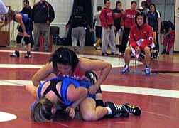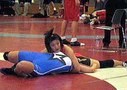 | ウォーミングアップ中の伊調馨 | 伊調馨はフォールで好スタート | 3試合を圧勝した伊調馨 | セコンドには姉の千春選手 |