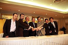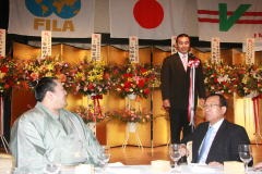| 会見のあと、団結を誓う福田会長(中央)ほか副会長ら。 | パーティーでは13競技の代表者がステージで紹介された。 | 馳浩衆議院議員のあいさつ。手前は福田会長と横綱朝青龍。 | 朝青龍らによる鏡開き。 |