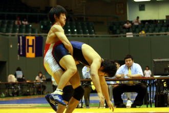 タックルが得意で、専門はフリースタイルだが、今大会のグレコローマンでは長い足を使い、リフトしてしまえばどんな選手でも足をマットから浮かせることができる。決勝戦では、持ち上げてからのローリングをズバっと決めて優勝を勝ち取った(左写真)。