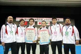 レスリングの国体黎明期は、新潟から始まったといっても過言ではない。第11回から5連覇を達成し、数多くの名選手が生まれた。だが、41年も総合優勝から遠ざかっており、新潟は苦しい戦いが続いていた。2度目の地元開催で、”強い新潟復活”を心待ちに、ひな壇には池田進・新潟県協会会長や、かつて新潟の黄金期を支えた和田喜久夫・県協会理事長(1972年ミュンヘン五輪銀メダリスト)など重鎮らがずらりとならんだ(右写真=新潟県チーム、右から3番目が平尾)。