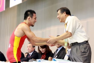 決勝戦はストレートで快勝。地元の応援も手伝って、大会で一番大きな拍手が平尾に贈られた。セコンドの原監督に連れられて、ひな壇の重鎮の方々にあいさつにいくと、全員が笑顔で平尾を迎えた。「池田新潟県会長からは、『ありがとう』と感謝の言葉をかけられました。感謝するのは僕の方なのに。優勝は新潟県のメンバーのおかげ。原先生をはじめ、全力でサポートをしてくれた」と、改めて新潟県への感謝を口にした(右写真=和田理事長から祝福される平尾)。