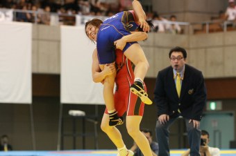 「軽量級の技の速さを見てもらいたい」と栄委員長が話す中で開始となった吉田−甲斐は、世界メダリスト同士の豪華な対決。“挑戦者”となる甲斐が果敢にタックルに行くが、タックル以外にも磨きをかけた吉田は、返し技など加点。その後は、伝家の宝刀、“両足タックル”で甲斐を大きく持ち上げて場外ポイントを奪うなど(右写真)、会場を大きく沸かせ、新潟国体のラストを華々しく飾った。