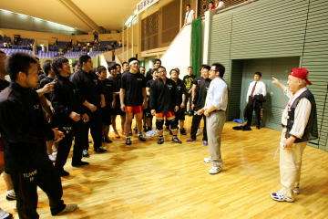 リーグ戦前には、須藤監督を扱ったテレビ番組で「名門・拓大」と書かれ、「ついに名門になったか」と苦笑してしまったという。拓大は戦前からのチームだが、東日本学生リーグ戦では2002年が、全日本学生王座決定戦は2006年が初優勝。宮澤氏の考える「名門」とは、歴史があり、かつ成績を残していること。その解釈からすれば、拓大が「名門」と書かれることはおかしい。「本当の名門にならなければ」と気を引き締めたそうだ(右写真=リーグ戦で優勝したあと、校歌を指示する宮澤氏)。