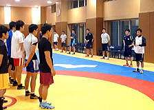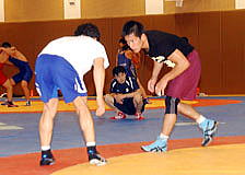 | 高田裕司専務理事が練習前にあいさつ。 | 湯元進一(右)と守田泰弘の練習を見る佐藤満強化委員長。 | グレコローマン・チームを指導する松本慎吾コーチ。 | 復活を目指す高谷惣亮の練習を見つめる和田貴広コーチ(右)。 |